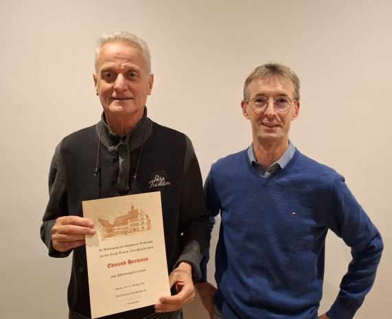 Bei der diesjährigen Mitgliederversammlung des Tischtennis-Clubs Staufen stand neben den Vorstandsberichten und den Neuwahlen auch eine besondere Ehrung im Mittelpunkt der Versammlung. Edmund Hermann, 1958 mit 11 Jahren in den Verein eingetreten und somit 67 Jahre Vereinsmitglied, wurde zum Ehrenmitglied des TTC ernannt. Er durchlief in jungen Jahren die Schüler- und Jugendmannschaften des Vereins. Er war Spieler der 1. Herrenmannschaft, die 1979 den erneuten Aufstieg in die Verbandsliga Südbaden schaffte und er war in den 80er Jahren eine Stütze der erfolgreichen 2. Mannschaft in der Bezirksliga. Edmund Hermann stellte sich auch von 1974 – 1987 für verschiedene Vorstandsämter im Verein zur Verfügung. So unter anderem als 2. Vorsitzender. Der 1. Vorsitzende Alexander Heißler überreichte ihm die Ehrenurkunde und ein Präsent des Vereins.